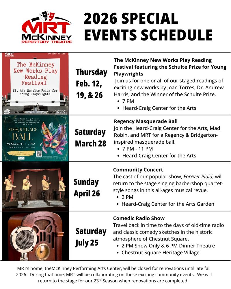 Join us for live staged readings at the historic Heard-Craig Carriage House and support local creativity and innovation. The 2026 festival will feature: