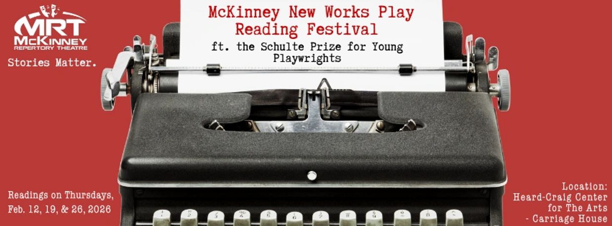 Thanks to a generous gift from Rainer & Sandra Schulte, MRT proudly presents the inaugural McKinney New Works Play Reading Festival and Young Playwright Competition, a celebration of creativity, storytelling, and NTX voices in theatre. This new event will showcase three original works by local playwrights - two established and the winner of the Schulte Prize for Young Playwrights. Each original theatrical work will be performed as a live staged reading in the intimate, historic setting of the Heard-Craig Carriage House in downtown McKinney.